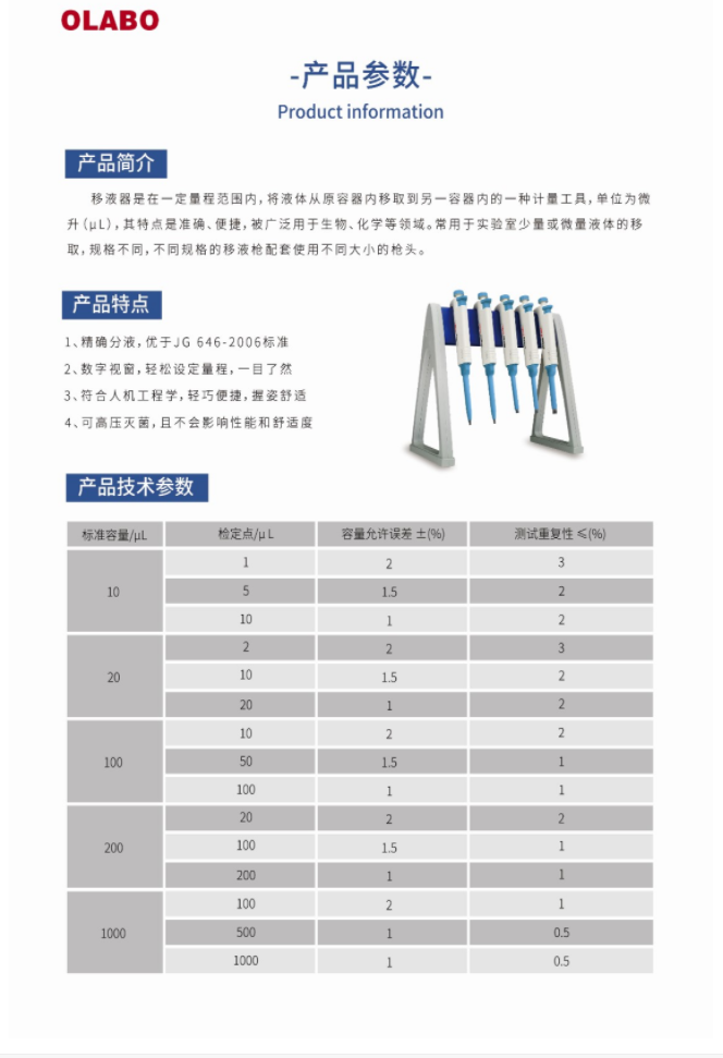 國產(chǎn)OLABO,B系列單道可調(diào)式移液器100-1000μl量程:100-1000μl,精確分液,數(shù)字視窗,符合人體工學(xué),握姿舒適