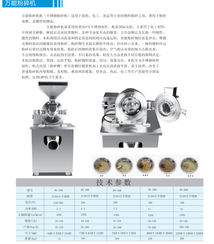 WN-200全能粉碎機(jī)產(chǎn)量10-120kg/h,不銹鋼制作,本機(jī)結(jié)構(gòu)簡(jiǎn)潔,堅(jiān)固,運(yùn)轉(zhuǎn)平穩(wěn),粉碎物料快速,均勻,效果良好。
