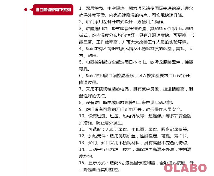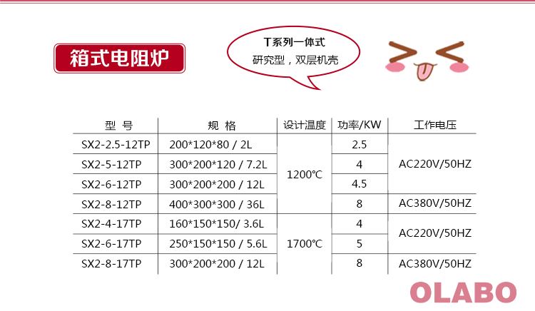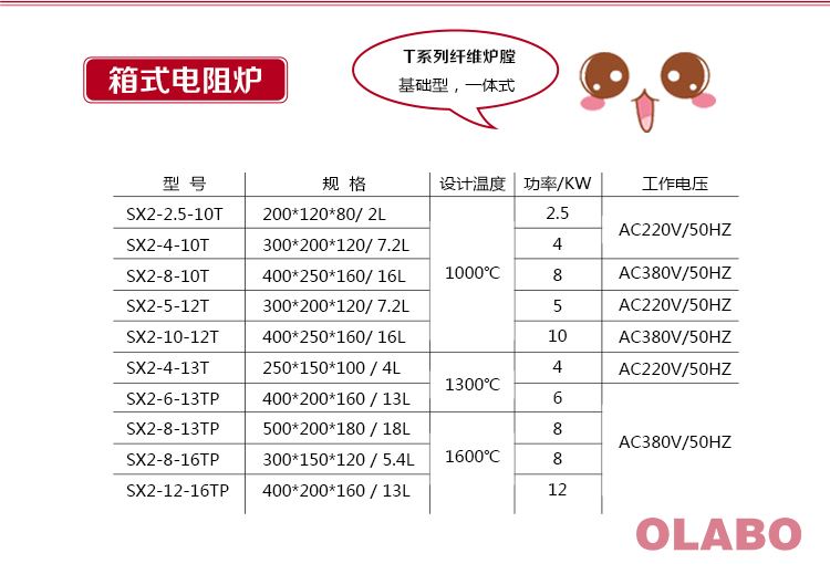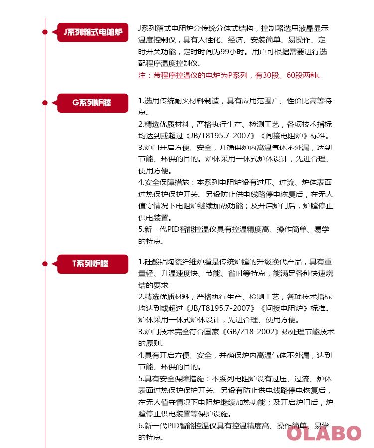 1、T系列爐膛---硅酸鋁陶瓷纖維爐膛是傳統爐膛的升級換代產品,具有重量輕、升溫速度快、節能、省時等特點,能滿足各種快速燒結的要求。 2、新一代PID智能控溫儀具有控溫精度高、操作簡單、易學的特點。 3、爐門結構采用全方位密封技術。具有開啟方便、安全,并確保爐內高溫氣體不外漏,達到節能、環保的目的。 4、具有安全保障措施:本系列電阻爐設有過壓、過流、爐體表面過熱保護保護開關。另設有防止供電線路停電恢復后,在無人值守情況下電阻爐繼續加熱功能;及開啟爐門后,爐膛停止供電裝置等保護設施。